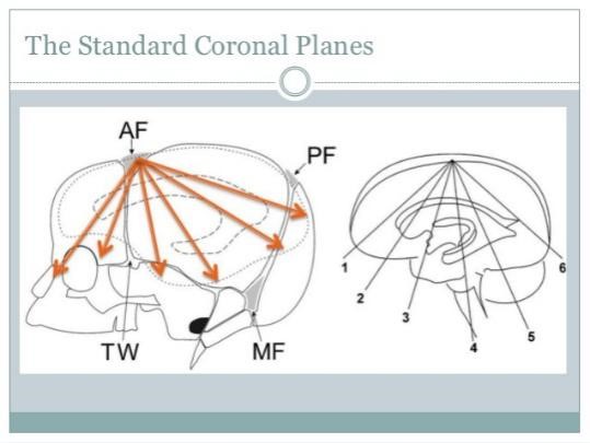 In the coronal view, your radiologist will take a number of images through the frontal lobes. They will then take images along the plane of the choroid plexus and then higher above it.