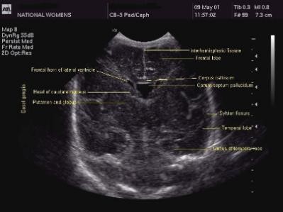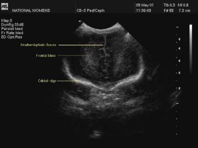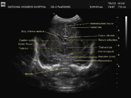 Angling the transducer any further will show a section close to the lateral ventricles. The above image shows the Sylvian fissure.