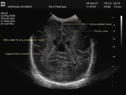 This image is taken by angling further back to cut through the trigones of the two lateral ventricles. It is easy to see the choroid plexus that fills both ventricles – it is usually quite prominent in preterm infants. It is, however, difficult to differentiate between bulky choroid and choroid plexus hemorrhage. The white matter evident in the image is called "flare" or "blush" and usually appears quite bright in this plane.