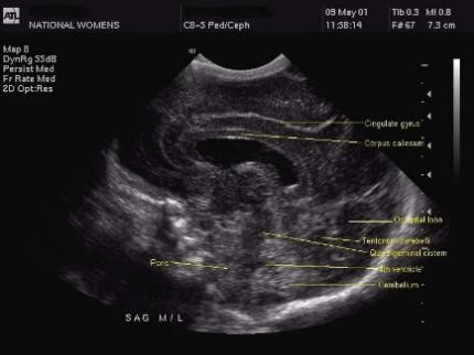 The image gives some important information. It shows the cerebellar vermis as a bright image with the 4th ventricle right in front of it. Right below the cerebellar vermis is the cisterna magna, which is not that bright. With the cingulated gyrus right above, the corpus callosum sweeps from anterior to posterior. A bit further above the posterior fossa is the parieto-occipita sulcus.