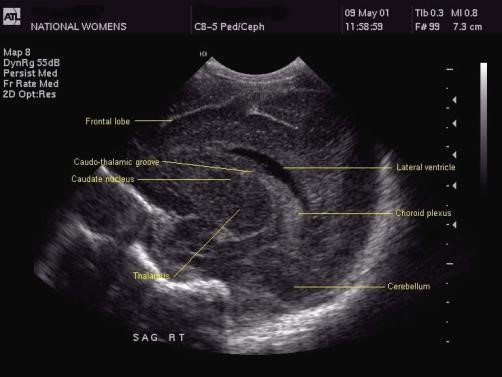 This neonatal head ultrasound shows the shape of the lateral ventricle. It is possible to see the caudate nucleus right below the frontal horn of the lateral ventricle with the thalamus right behind and below it. The occipital horn contains choroid plexus, whereas the choroid is in the caudothalamic groove, and it may or may not be echogenic.